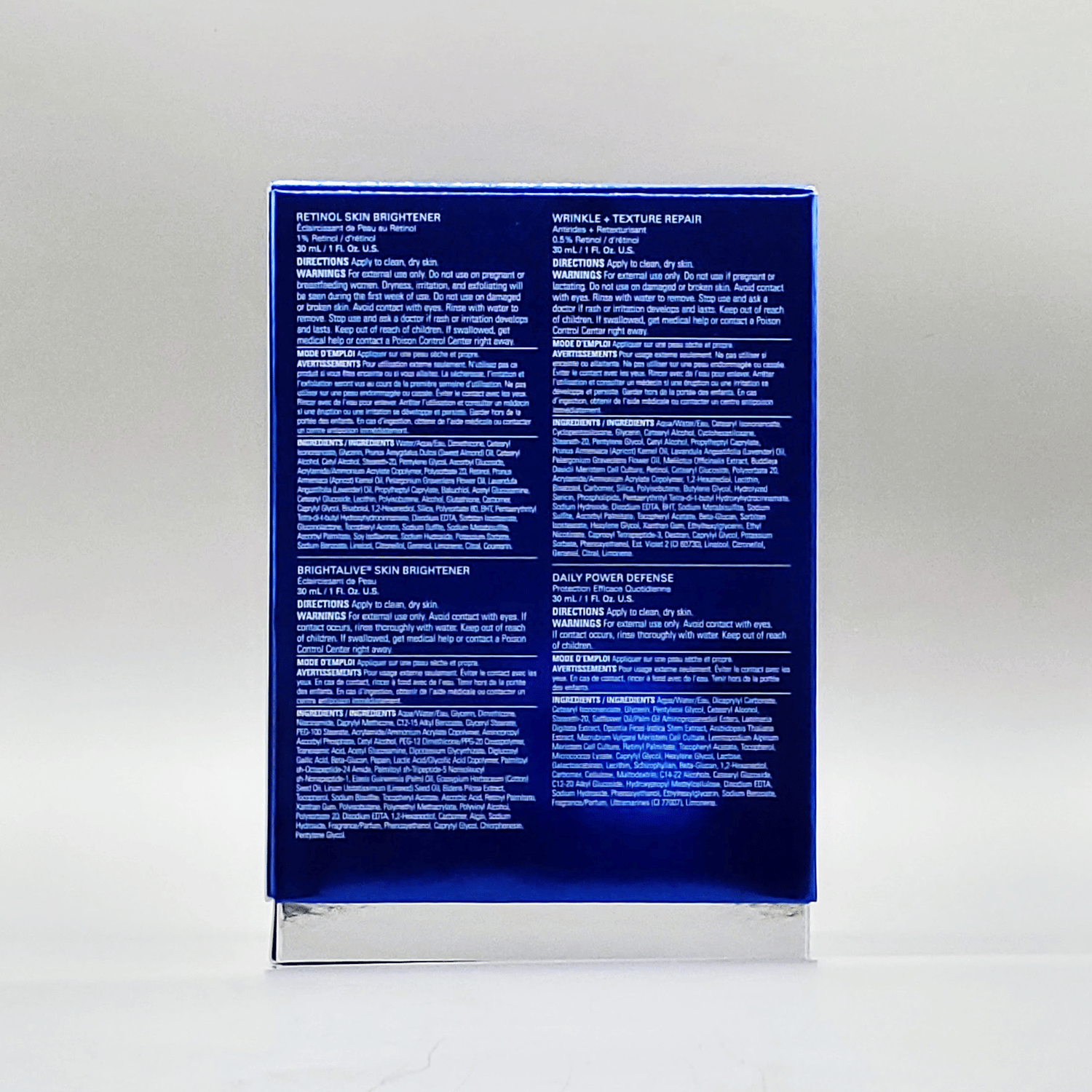 This multi-product regimen includes the Retinol Skin Brightener 1%, Daily Power Defense, Wrinkle + Texture Repair, and Brightalive®. Each product is packed in a convenient 30 mL / 1 Fl. Oz. travel size, making it perfect for on-the-go skincare.